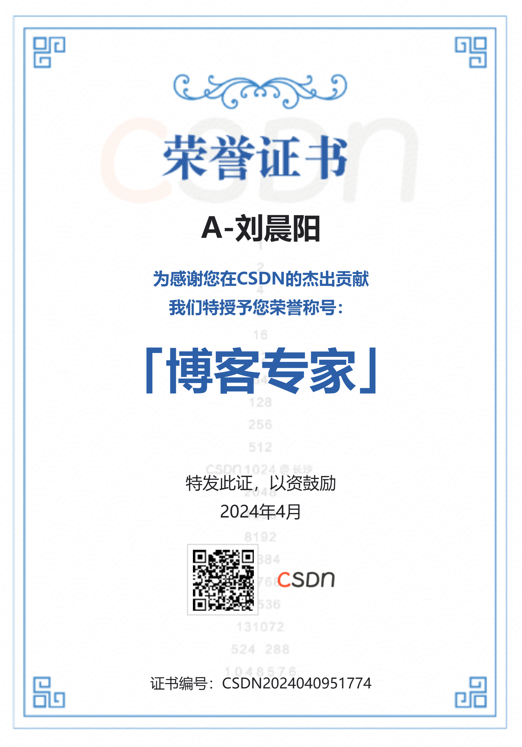 | 博客专家证书 | ![]() | CSDN2024040951774 | ||