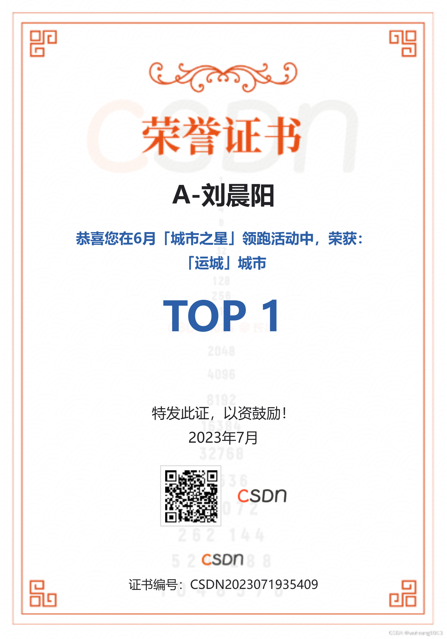 | CSDN | 2023 城市之星证书 | ![]() | CSDN2023071935409 | CSDN查询地址 |